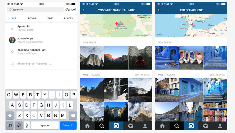 s’améliore, et outre les personnes ou les tags, il est possible de lancer une recherche via les lieux ou filtrer les contenus les plus pertinents. Comme le précise le blog d’Instagram cela peut s’avérer intéressante si vous planifiez des vacances ou encore pour localiser l’endroit de votre prochain shooting photo.