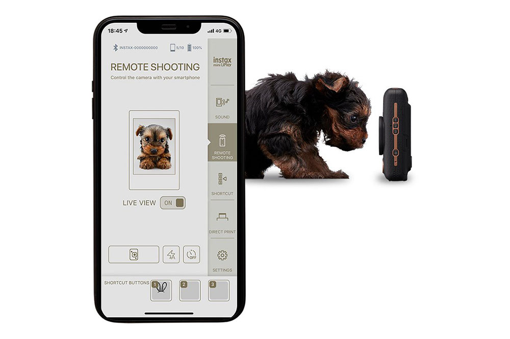 Connecté à un terminal mobile à l’aide du Bluetooth et de l’application Fujifilm dédiée, l’Instax Mini LiPlay peut de plus être déclenché à distance. Il est aussi possible d’obtenir des tirages photographiques des photos stockées sur un smartphone, en se servant du LiPlay comme d’une simple imprimante instantanée.