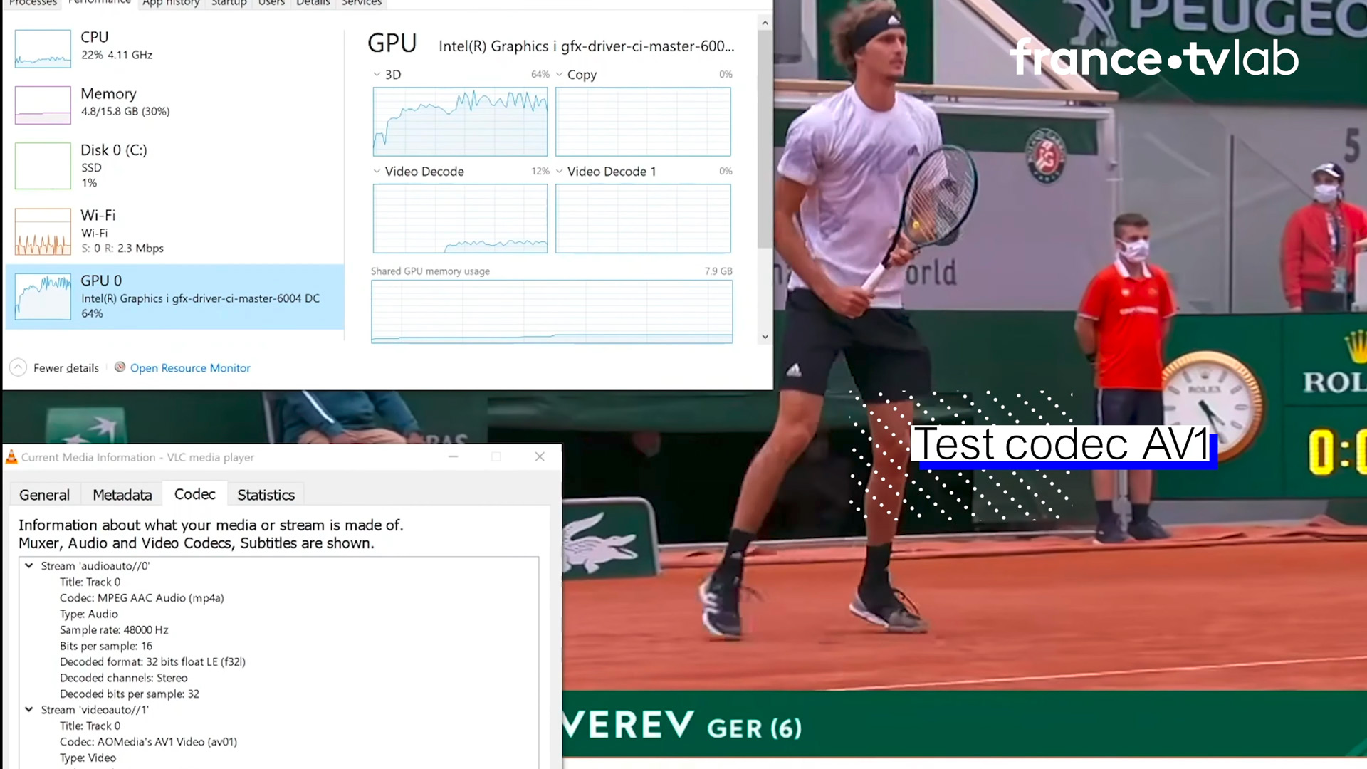 We are using a basic popular player: VLC. More specifically, a beta version of VLC in which the AV1 codec was implemented. VideoLAN, the VLC editor, had to rewire VLC to enable it to process the hardware decoding part of the AV1 flow by Intel’s GPU. VLC simply had to be optimised ahead since it is originally meant to read almost all formats available. When those new CPUs will be on the market, we know that VLC will be able to read AV1 files.