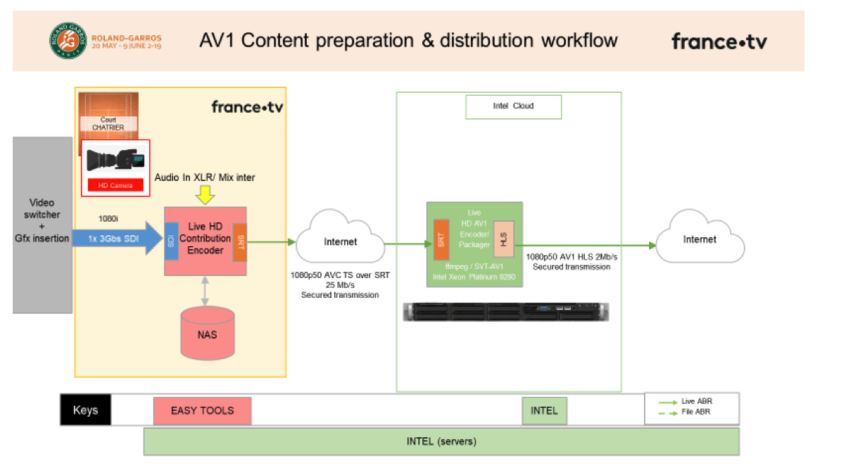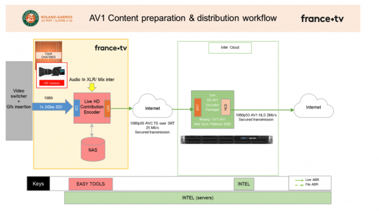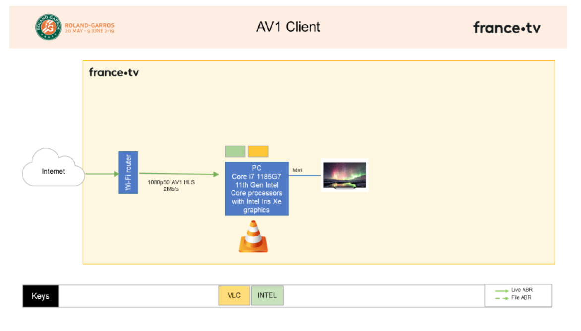 This encoding was processed in real time using the flow filmed by France Télévisions. An 1080p image at 50p was sent to the Intel server (Dual Xeon 8280). Being encoded live in AV1, its flow was then sent using Wi-Fi to the portable PC (including Intel® Core® 11th generation mobile chips) which decodes in real time too, Live. A real ultrabook was used, not a Gaming PC. This is a pre-series computer since the new Intel platform has just been announced. But mass production series are around the corner. This means that a basic portable PC is now able to read an AV1 flow.