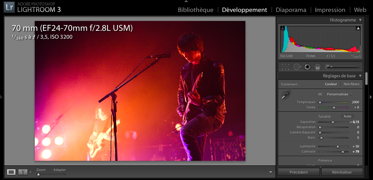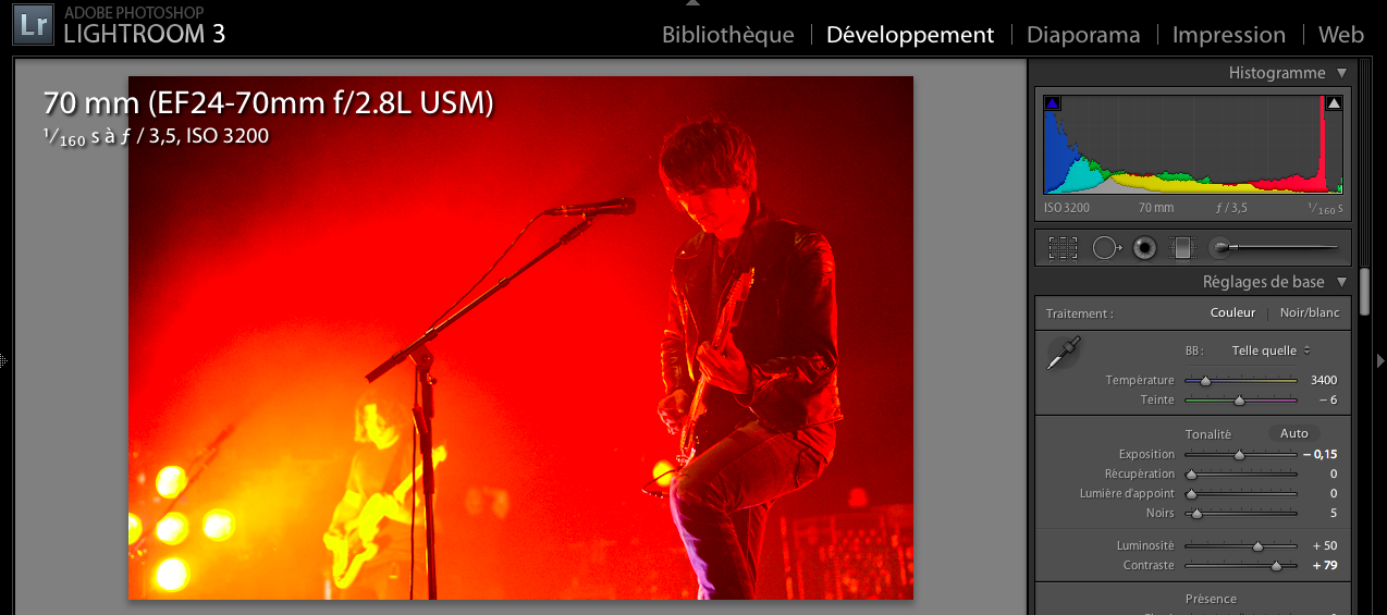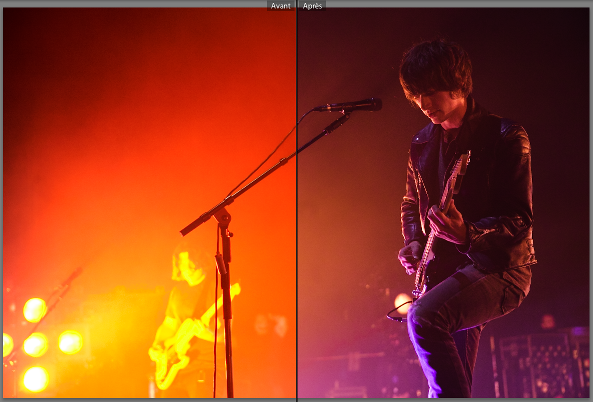 Si j’avais pris la pipette pour modifier la balance des blancs en cherchant un élément « blanc » ou qui se rapproche du gris, j’aurais eu le résultat suivant assez éloigné de la photo ci-dessous, mais plus proche de la réalité et des lumières présentes sur la scène ce soir là :