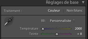 Du coup on n’utilisera pas la pipette pour aller chercher un blanc (ou gris neutre) pour que la balance se fasse : ici je vais délibérément refroidir la température en prenant une balance des blancs à 2000K. J’en profite pour augmenter la teinte au passage.