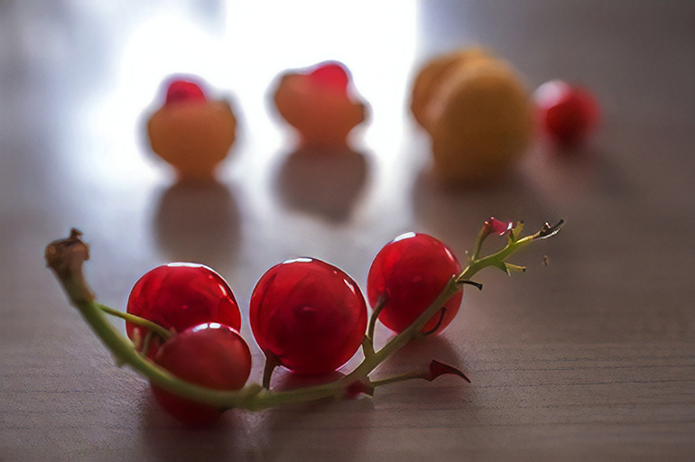 Agrandissement X 2 réalisé par Let’s Enhance depuis un fichier en 385 pixels de large. Notez les détails de la table au premier plan, de la tige, et l’arrondi des fruits que la solution a réussi à reconstituer.