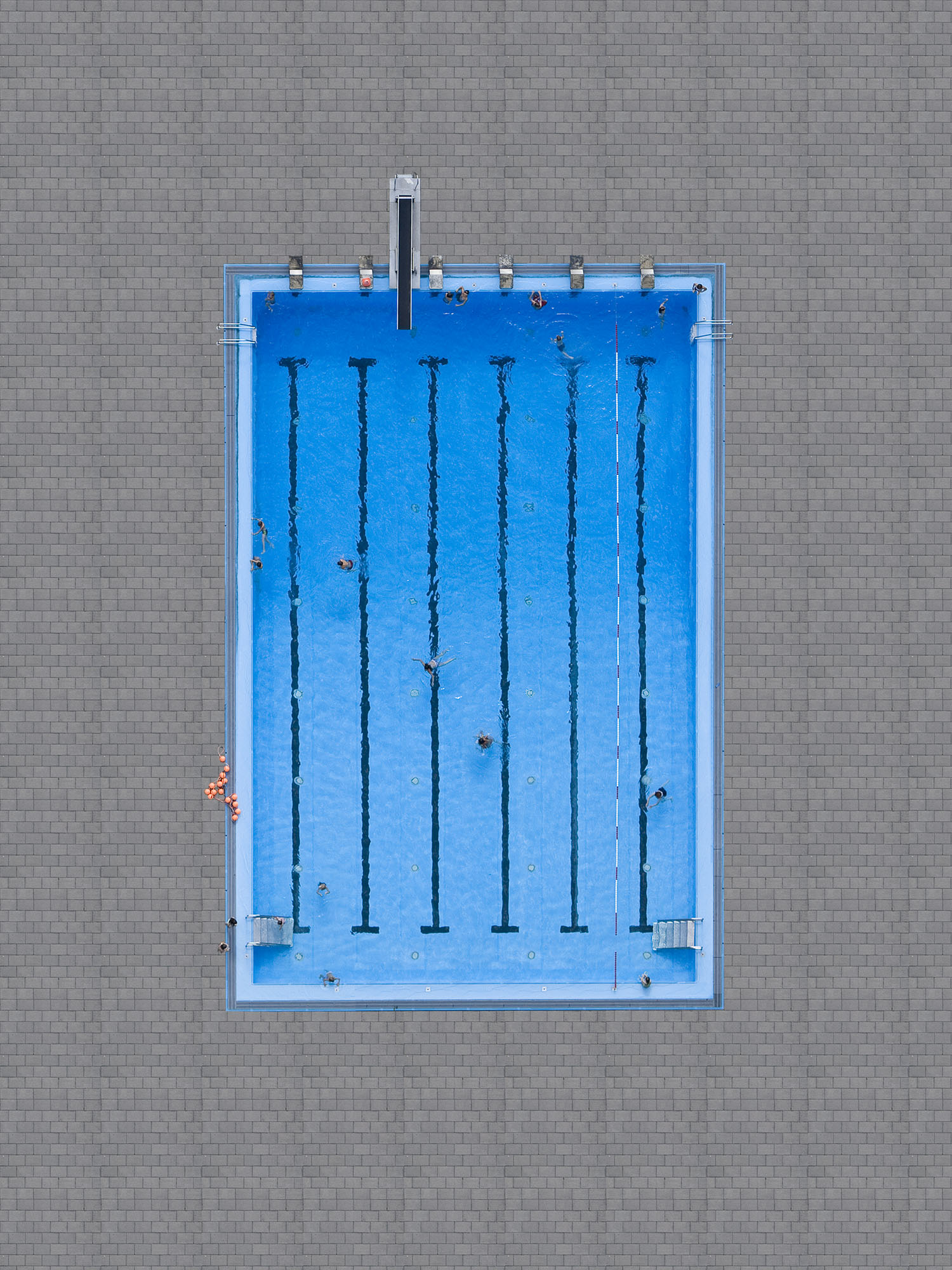 Il suffit, parfois, de déplacer simplement une perspective pour voir la même chose d’une manière totalement inédite. C’est ce que Stephan Zirwes s’emploie à produire en photographiant des piscines municipales de haut, en quittant le point de vue horizontal habituel. Lieu connu, maintes fois visité, souvenir de cours d’EPS, la piscine est un lieu public à la fois banal à la fois mystérieux.