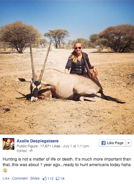 La machine s’est enclenché très vite : L’Oreal, célèbre marque de cosmétique, l’a contacté pour devenir modèle. Et aussi soudain que le buzz est arrivé, le bad buzz a pris le relai. Peu après avoir accepté l’offre de l’Oreal, Axelle Despiegelaer a publiée une photo sur Facebook ou elle prenait la pose en compagnie d’un trophée de chasse.