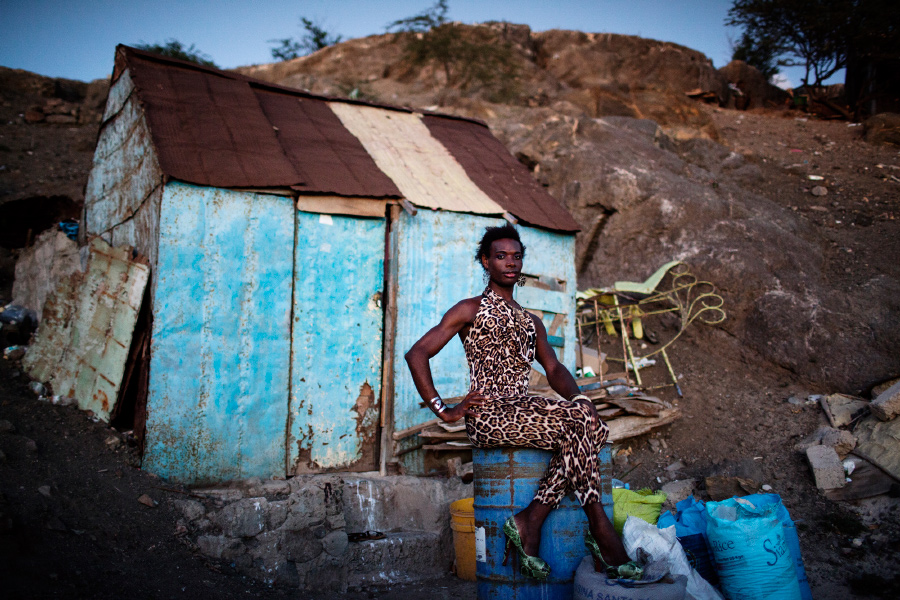 J’étais invitée en 2014 à une résidence artistique à Mindelo, au Cap Vert, pendant le “Festival Internacional de Cabo Verde”. Quand je suis arrivée j’ai rencontrée Stephy, une personne transgenre (garçon vers fille) magnifique et deux de ses amis, eux aussi trans. J’ai réalisé qu’il y avait une petite communauté qui vivait près de la ville. Ils m’ont fait rencontrer leurs autres compagnon.nes : Edinha, Gi, Elton, Sindji, Susy, Henio et Jason. Ce groupe est composé de jeunes entre dix-sept et vingt-cinq ans qui ont décidé de s’habiller en femmes et se sont donnés des prénoms féminins, qui en somme, vivent librement leur genre. J’ai aussi découvert que dans le coin il y a une pierre qui, selon la légende, rend les garçons gay. Mon projet s’est alors articulé autour de ce rocher, d’où le tire Quel Pedra, qu’en créole signifie « cette pierre-là ».