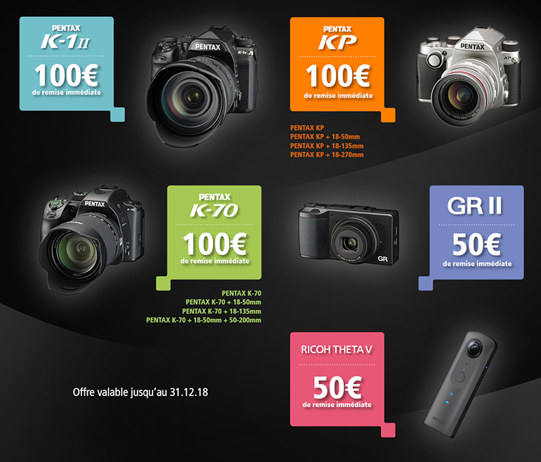 Jusqu’au 31 décembre 2018, Pentax propose une remise immédiate en caisse allant jusqu’à 100 € sur certains appareils de la marque.