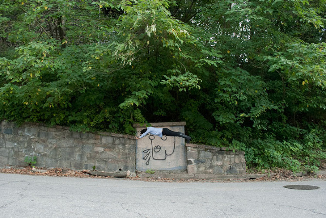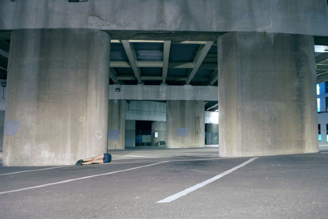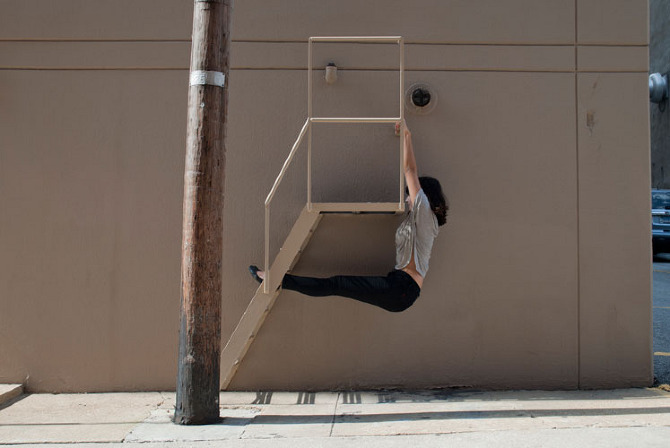 Dans l’intimité de son appartement ou devant les barres d’immeubles , elle ajoute des corps qui se contorsionnent, s’étirent, sautent, disparaissent. En jouant avec l’architecture, les angles, les perspectives, Sam Schubert redonne des courbes et de la souplesse aux environnement (trop?) géométriques.