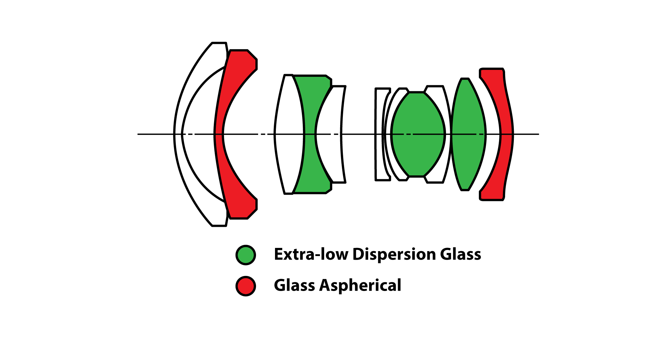 L’optique bénéficie du label Zero D pour « Zero Distorsion ». Elle s’architecture autour de 11 élements associés en 7 groupes. Un diaphragme à 5 lamelles gère la page d’ouverture qui s’étend de f/2 à f/22.