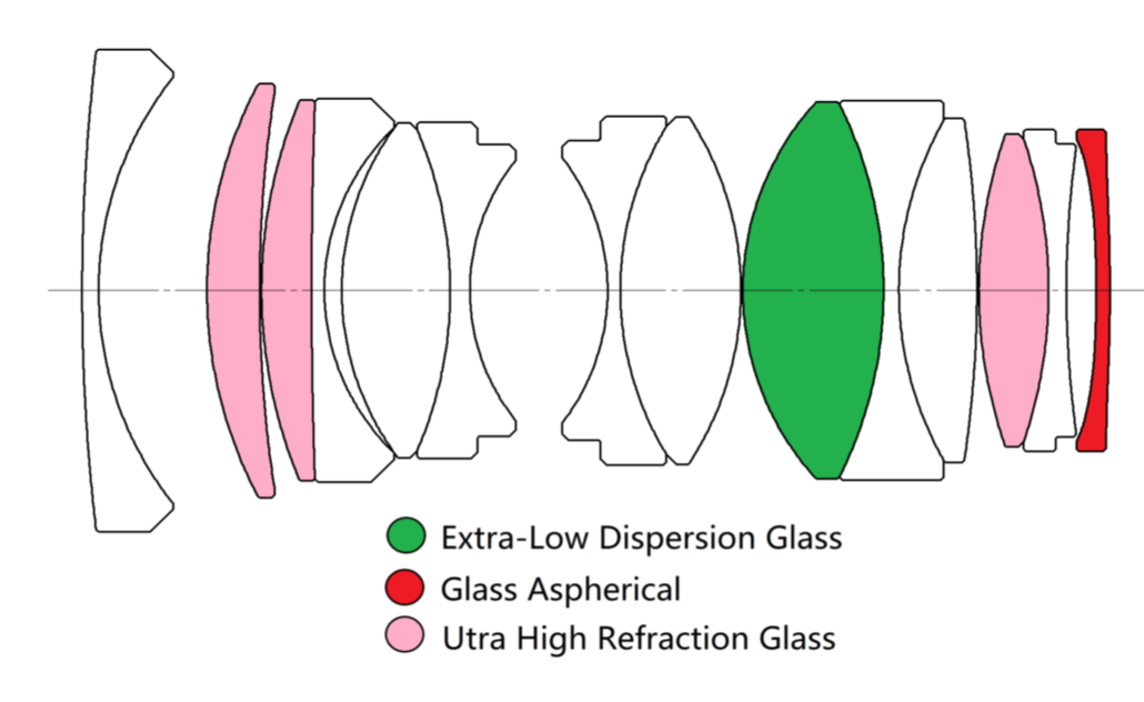 Parmi les 14 verres se trouvent un élément à très faible dispersion, un élément asphérique, et trois a très grande réfraction. La gestion de la plage d’ouverture qui s’étend de 0,95 à 11 est confiée à un diaphragme à 9 lamelles.