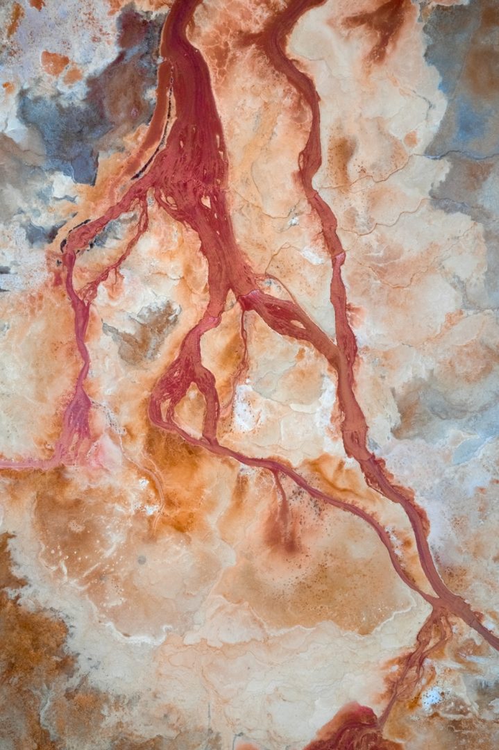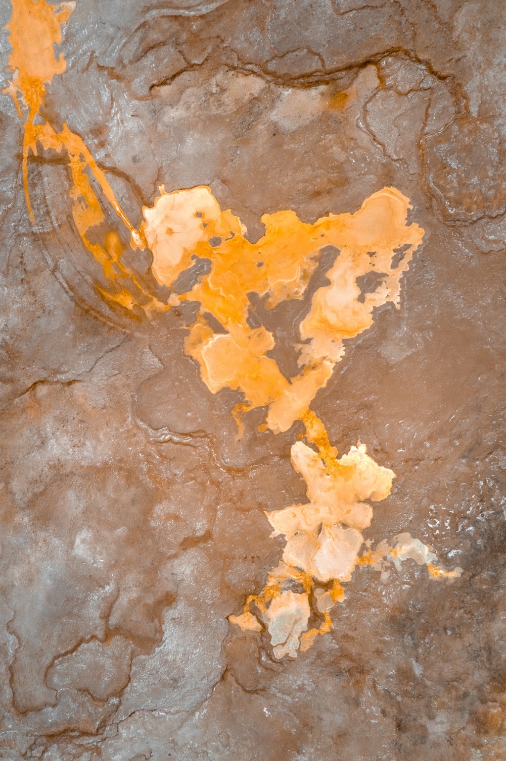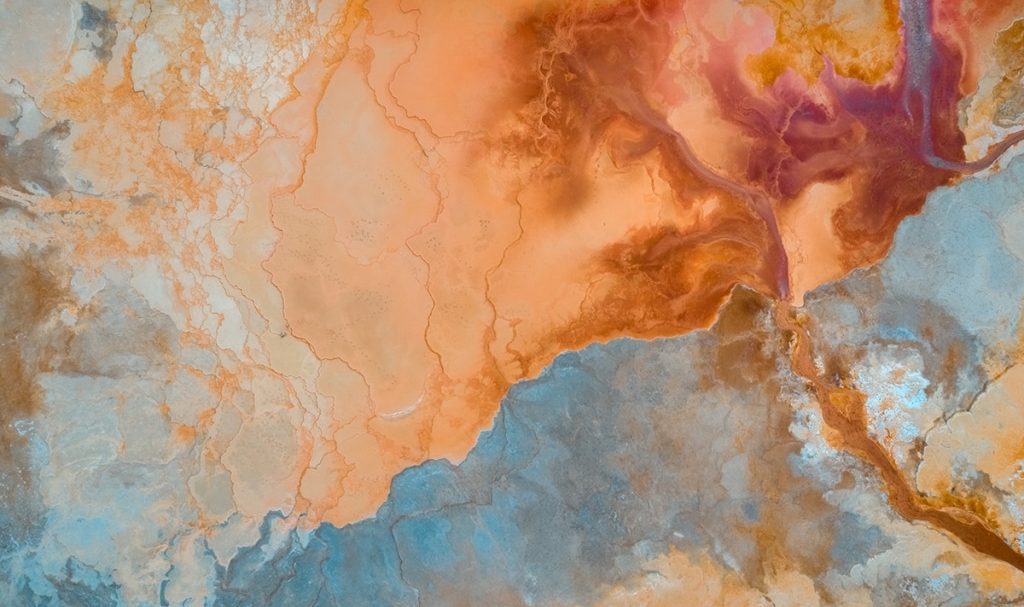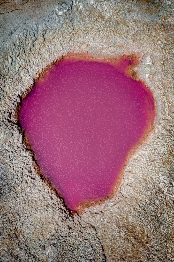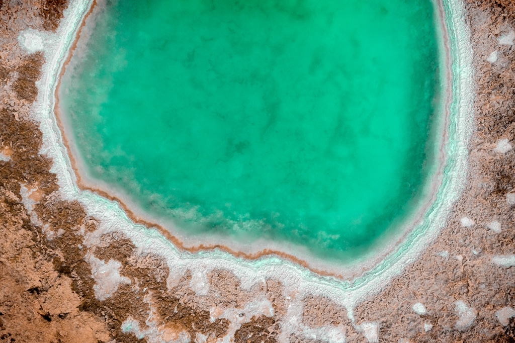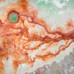 Dans sa dernière série photographique, Jonas est parti découvrir les Aiken Spring, des sources d’eau enfuies dans le désert chinois de Gobi. Ici, le soufre est omniprésent et forme des compositions colorées aux nuances magnifiques. Ce minéral, le cinquième le plus répandu sur notre planète, est mis à l’honneur dans la série, prise comme d’habitude aux infrarouges, cette fois en modalité aérienne.