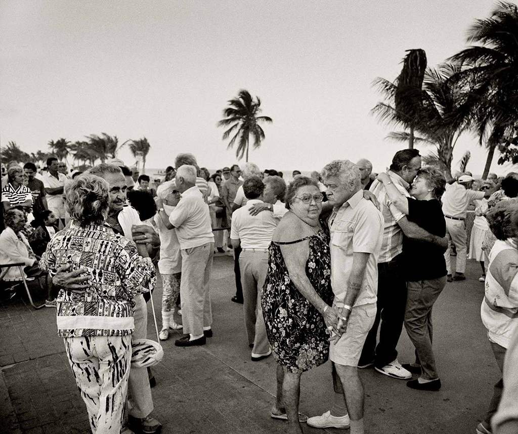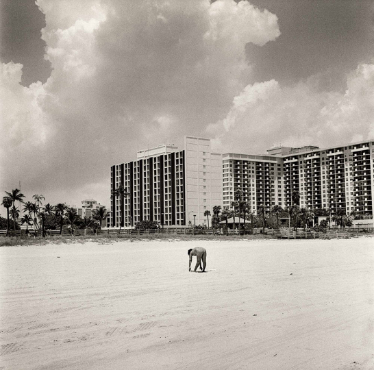 Des bodybuilders côtoient des drag Queens et la scène LGBT s’affirme en créant une sorte de paradis de la fête où tout semble permis. Le nudisme est une pratique courante tout comme le travestissement, dans cette ville à part qui se transforme en la définition même du « bling bling ». Barry Lewis photographie ces personnages inspirants et intrigants : des modèles, des policiers, des culturistes, des retraités aisés. Certains font du skate ou du surf, d’autres se déplacent le long du littoral en limousine, d’autres encore dansent gaiement et s’adonnent à des pratiques sportives entre voyeurisme et culte du corps. Chaque bijoux, chaque détail, chaque trait de maquillage contribue à instaurer le mythe de la ville qui ne dort jamais. Le noir et blanc confère à la série un aura de paradis perdu, en donnant une vision de Miami déconnectée du temps et de l’espace, une bulle de dolce vita et de légèreté.