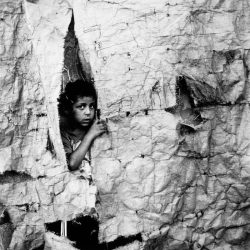 Raed Bawayah, Jeune garçon écartant un rideau de sacs recyclés, série Childhood Memories, 2002-2003, FNAC 07-461, Centre national des arts plastiques, droits réservés/Cnap, crédit photo : Yves Chenot