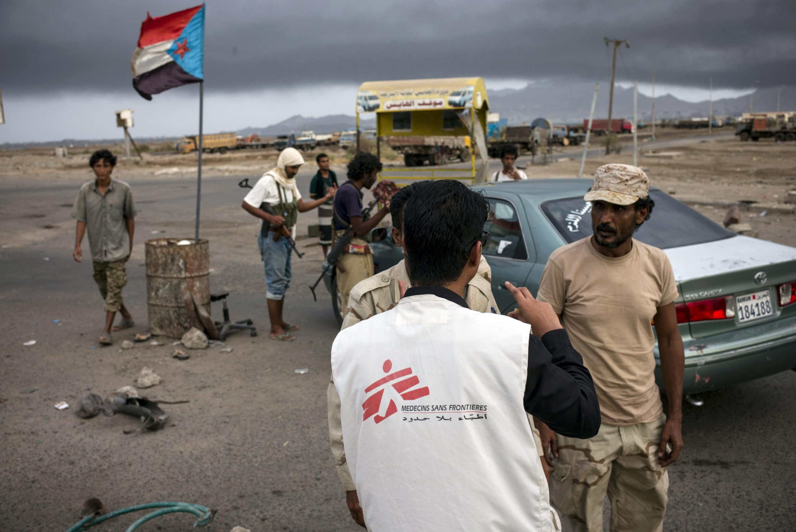 MSF team in Aden's streets. An MSF staff is speaking with armed men at a check point. -