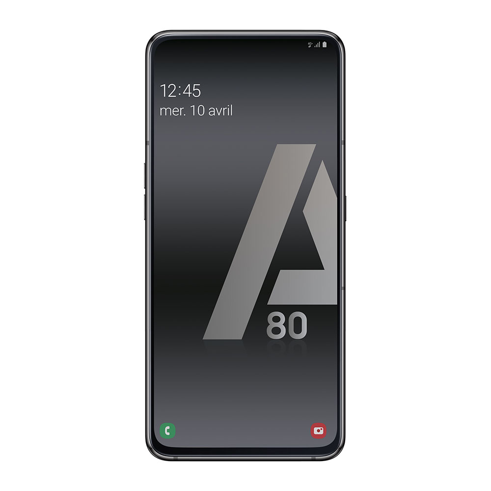 Adieu encoche, adieu orifice pour APN ; l’écran du Samsung Galaxy A80 propose une surface complètement uniforme d’une diagonale de 6,7″. Cet afficheur dispose d’un ratio 20:9 et bénéficie de la technologie Super Amoled ainsi que d’une définition de 2 400 x 1 080 px. Le capteur d’empreintes digitales de l’A80 trouve d’ailleurs sa place sous cet écran. Le reste de la fiche technique du dernier terminal Galaxy mentionne une puce mobile Qualcomm Snapdragon 730, 8 Go de mémoire vive, 128 Go d’espace de stockage (non extensible via microSD) et une batterie de 3 700 mAh.
