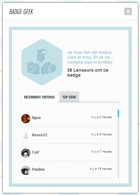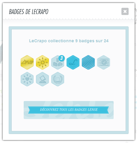 Dernier système de récompenses et non des moindres, les fameux badges qui récompensent une certaine activité ou indiquent une information sur un Lenser.