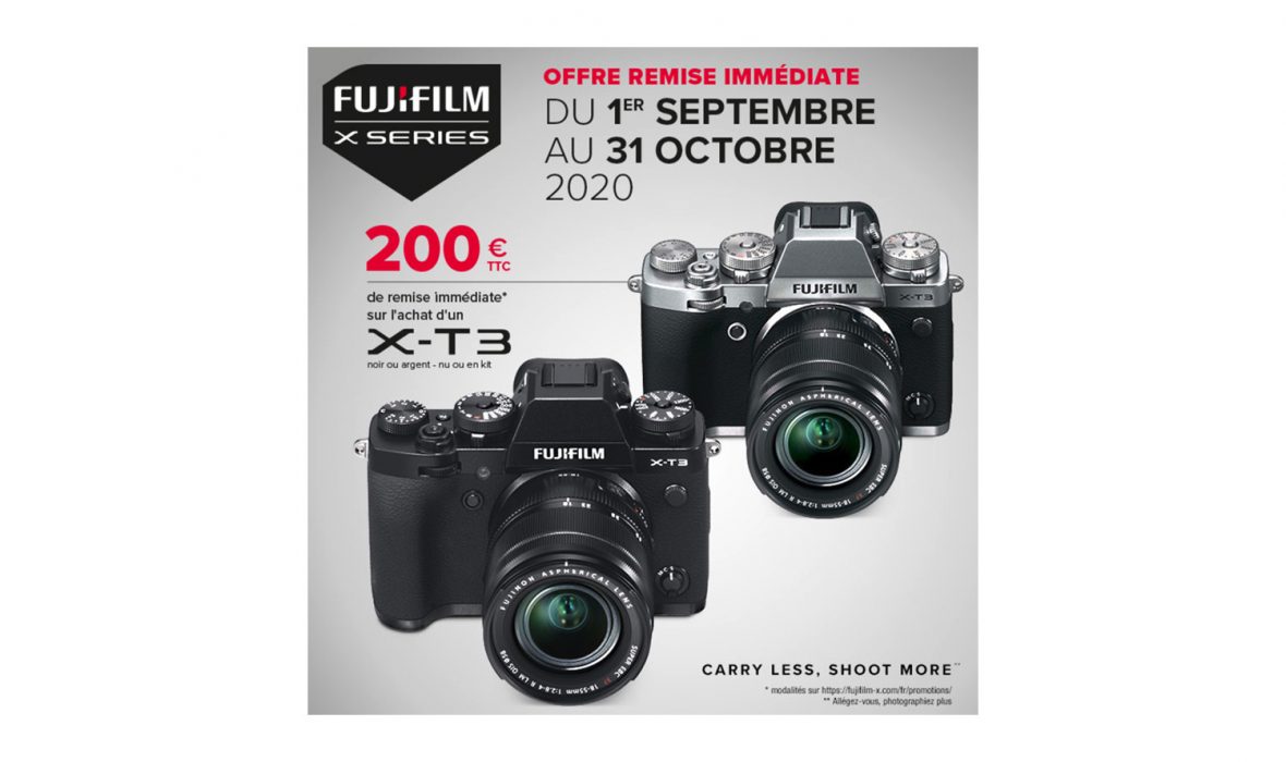 La rentrée rime avec remise ! C’est au tour de Fujifilm de proposer d’une offre de remise immédiate en caisse (et non une ODR). Pour tout achat d’un boîtier hybride X-T3 (nu ou en kit), en version noir ou argent, une réduction de 200 € est appliquée.