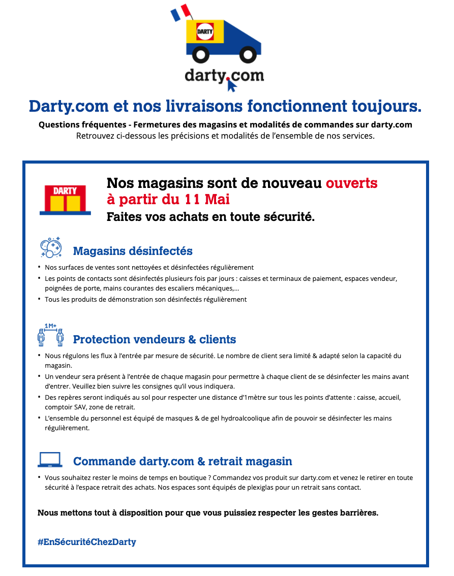 Pour les magasins de ce spécialiste des biens techniques et électroménagers, leurs sites Internet respectifs indique bien une ouverture le 11 mai 2020.