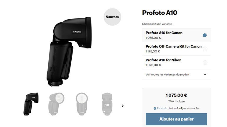 Le Profoto A10, proposé en version pour Canon, Nikon, Sony, Fujifilm, est disponible seul pour 1 075 €, mais est aussi disponible en Kit avec le Profoto Connect pour 100 € de plus.