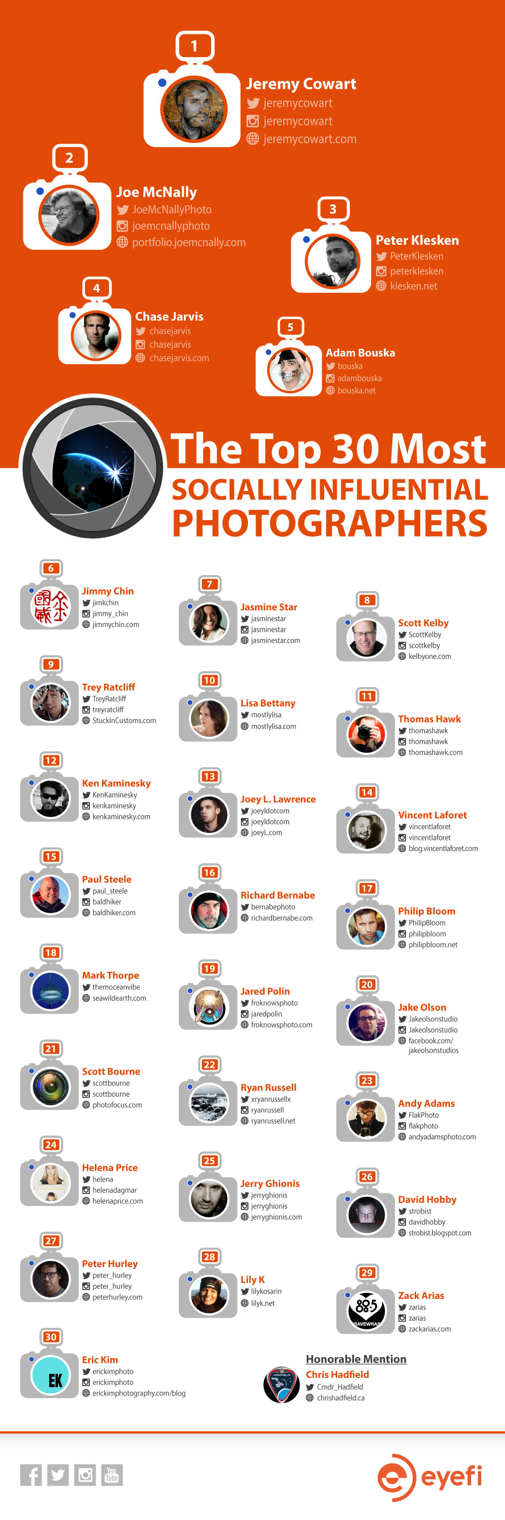 Vincent Laforet, Scott Kelby, Trey Ratcliff, Philipp Bloom… et même Chris Hatfield font le classement, (exclusivement) dominé par des américains (où sont les photographes asiatiques, comme Kai de Digital Rev ?) découvrez la liste ci dessous avec le site web, le compte Instagram et Twitter de chaque influenceur.