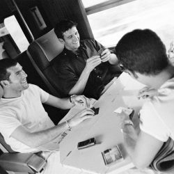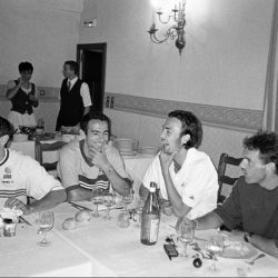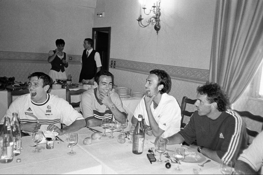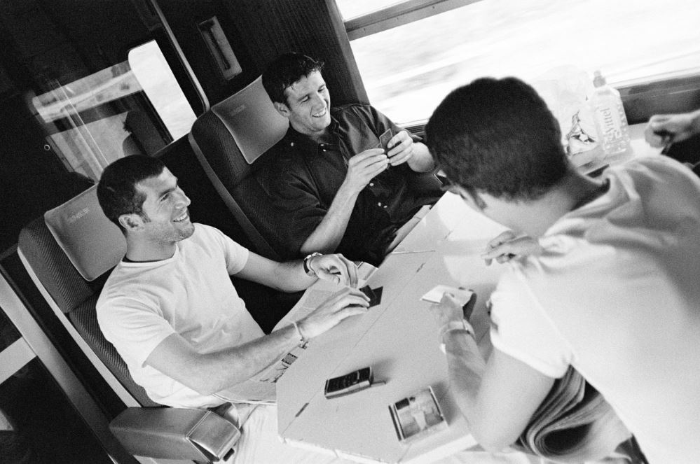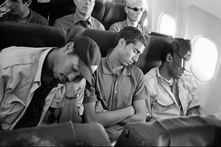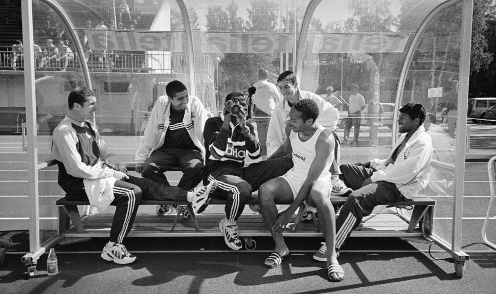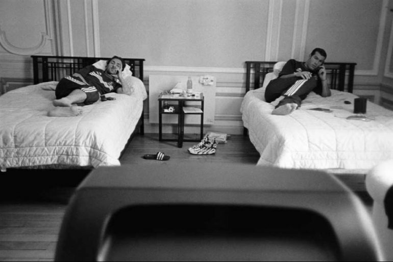 Dans ce cadre exceptionnel, les photographies de Stéphane Meunier sont comme un manifeste de cette discipline. Pour autant, elles dépassent l’image de sport en se focalisant sur des clichés intimes. C’est en suivant les bleus en 1998 que le photographe réalise son documentaire culte Les yeux dans les bleus, film et série photo illustrant la vie des jeunes footballeurs en dehors des matchs. C’est-à-dire dans cet entre-deux étrange entre une compétition et l’autre où la tension descend et les sportifs relâchent leurs muscles, les corps décontractés.