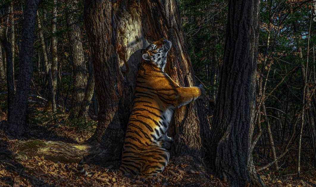 Sergey Gorshkov a remporté le grand prix du Wildlife Photographer of the Year. La photo, intitulée L’étreinte, montre le moment intime où une tigresse de Sibérie, une espèce en voie de disparition, étreint un ancien sapin de Mandchourie pour le marquer de son odeur. Il a fallu plus de 11 mois au photographe russe pour prendre cette photo à l’aide d’appareils capteurs de mouvement.