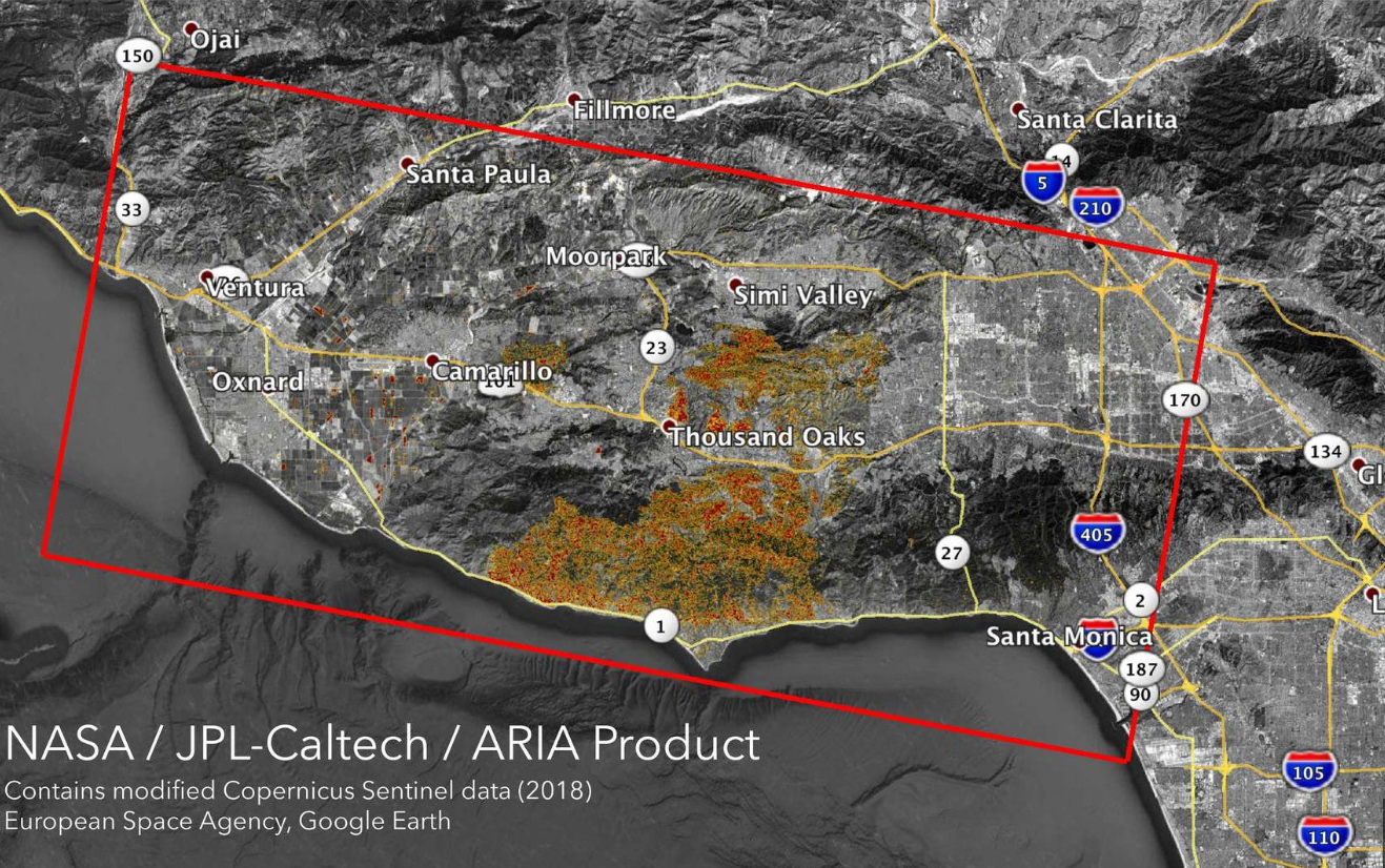 La carte ci-dessous montre la surface des dommage causés par le « Woolsey Fire » au sud de la Californie, au 11 novembre. Le rectangle rouge mesure 80 sur 40 km :