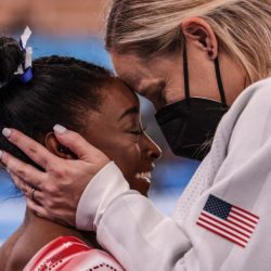 Le soulagement sur le visage de Biles, l’étreinte chaleureuse de son entraîneuse, le masque qui cache son visage, le drapeau américain. Une image qui résume à elle toute seule l’aventure humaine qu’est la carrière sportive de cette grande championne qui a décidé de se retirer de la compétition en préférant prendre soin de sa santé psychologique.