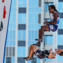 Mickael Mawem, de France, montre sa joie après avoir battu le grimpeur américain Nathaniel Coleman en finale de l'escalade de vitesse (Robert Gauthier / Los Angeles Times). -