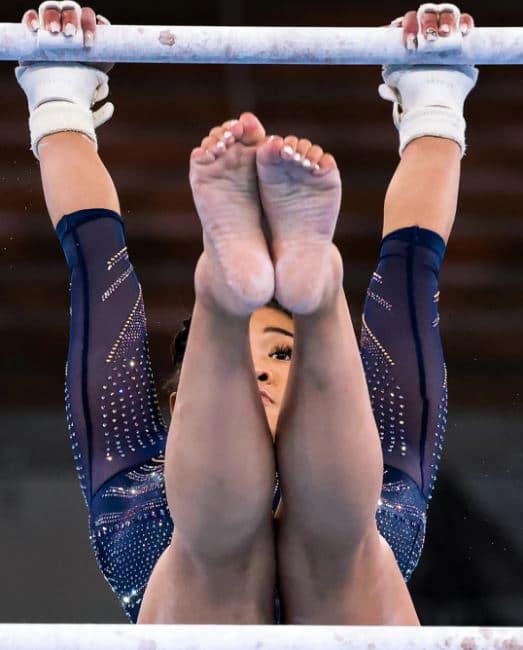 La gymnaste américaine Sunisa Lee s'exécute aux barres asymétriques. Elle a remporté la médaille de bronze avec un score de 14,50. (Robert Gauthier / Los Angeles Times) -