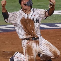 Le receveur de l'équipe du Japon, Takuya Kai, célèbre après avoir marqué depuis la première base dans un match de demi-finale olympique contre la Corée. (Robert Gauthier / Los Angeles Times) -