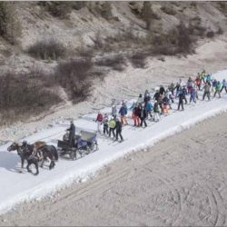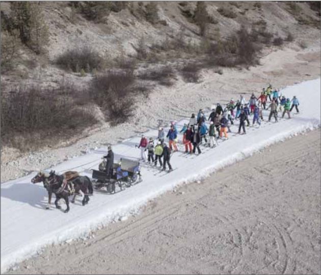A group of tourists pulled by a sled along the bed of a river that has been artificially snowed. © Marco Zorzanello -