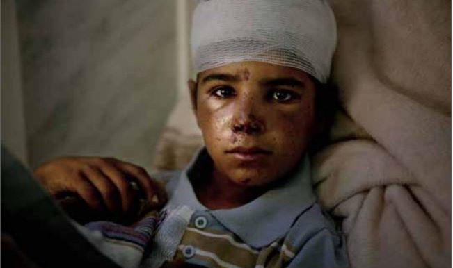 Lauréate du Visa d’or Paris Match News, Véronique de Viguerie nous présente un portrait d’enfant de 11 ans, Chaher, pris au Yémen, faisant partie de la série « Yémen, la guerre qu’on nous cache ». blessé par une frappe aérienne alors qu’il surveillait son troupeau avec son frère. e. Il faut lui retirer un éclat logé dans le cerveau, mais l’hôpital n’a ni chirurgien ni appareil d’IRM. L’image est à elle seule un pont entre journalisme, reportage de guerre, art et document historique, synthèse de ce que ce prix se propose de promouvoir depuis trente ans.