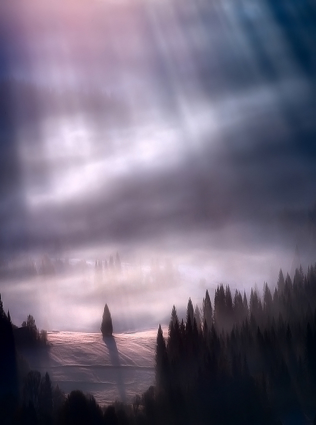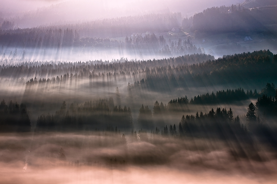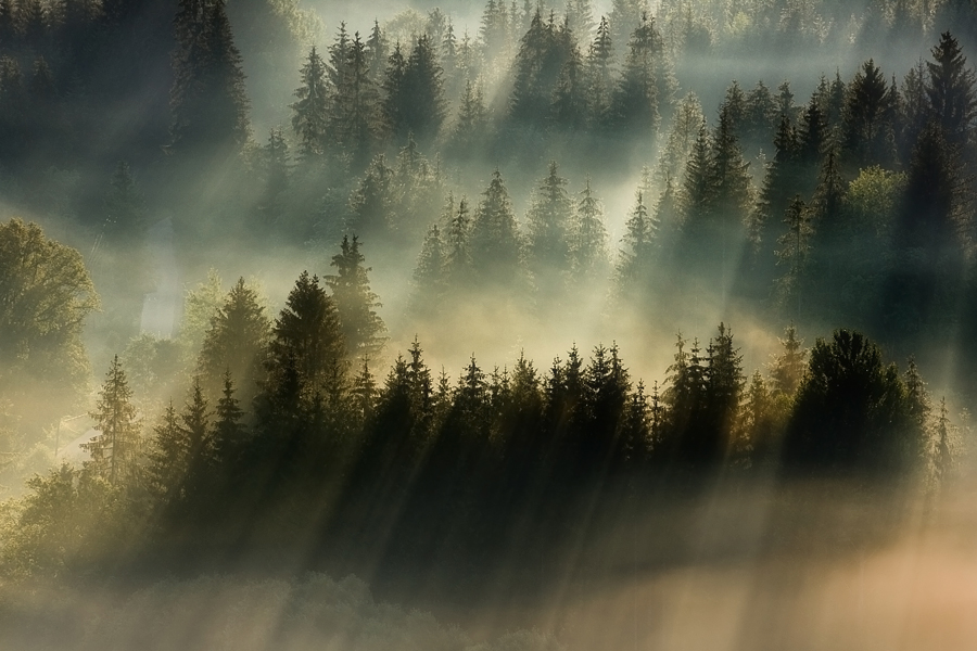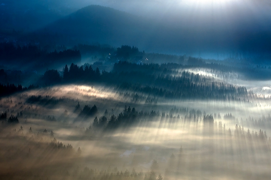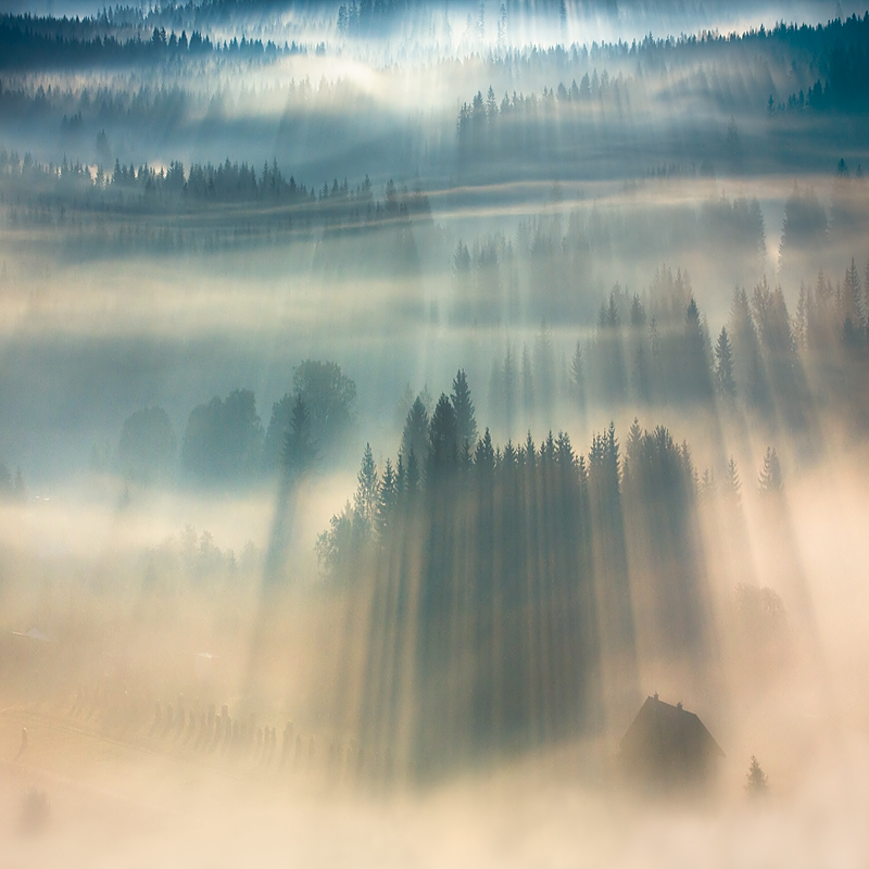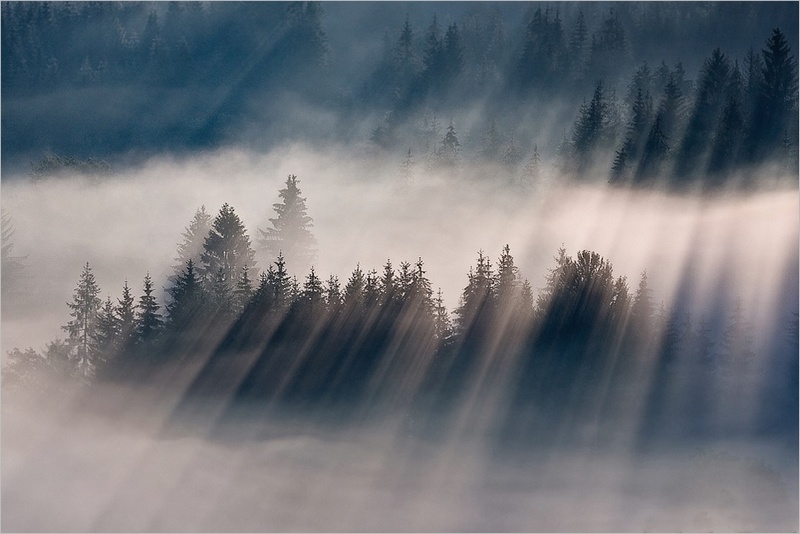 Témoin de ces instants de flottement où se croisent la fin de la nuit et le lever du soleil, le photographe Boguslaw Strempel revient les bras chargés de ces fascinants paysages. Des plaines et des collines rendues surnaturelles par la densité des rayons traversant ces épaisses couches de nuages, par les traits de lumière traversants les arbres. La patience du photographe et le travail autour de l’exposition se chargent du reste.