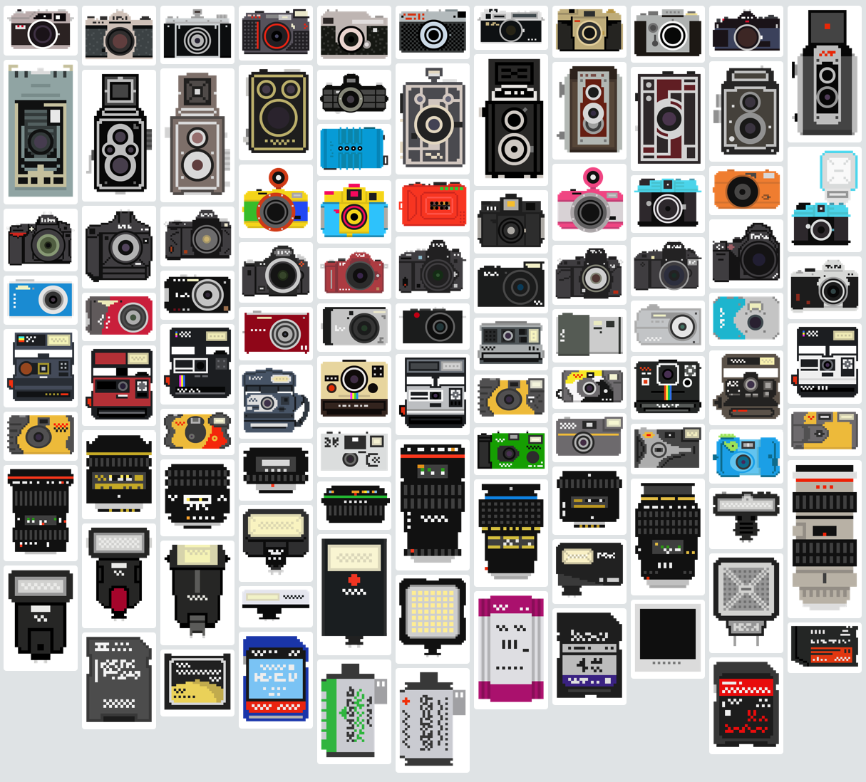 Juste un gros coup de coeur en ce début de semaine pour cette collection d’appareils, objectifs et accessoires photo en gros pixels qu’on aime, par l’artiste Bill Brown.