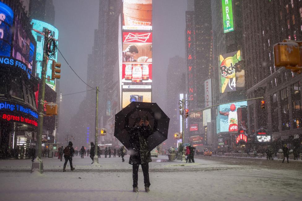 13th. A man stands under an umbrella while photographing a snow storm in Times Square, New York, January 26, 2015. REUTERS/Adrees Latif
