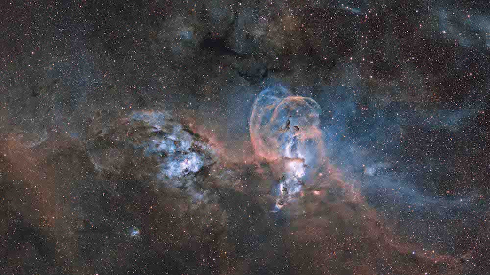 Très frappante aussi la photographie de la nébuleuse de la Statue de la Liberté, en couverture de cet article, qui héberge une grande quantité d’étoiles et dont le vrai nom est NGC 3576. Elle nous surprend pour l’incroyable quantité de couleurs et tonalités différentes.