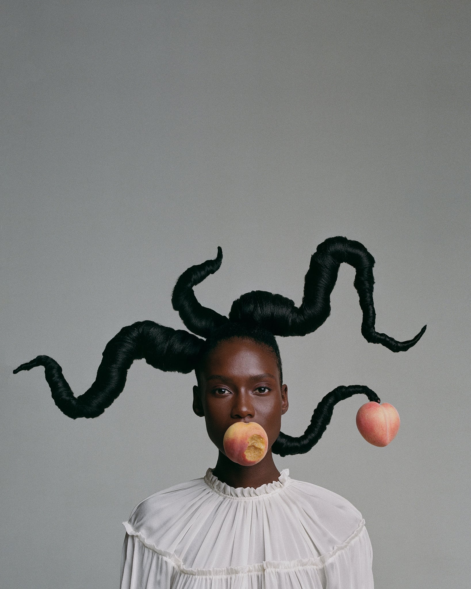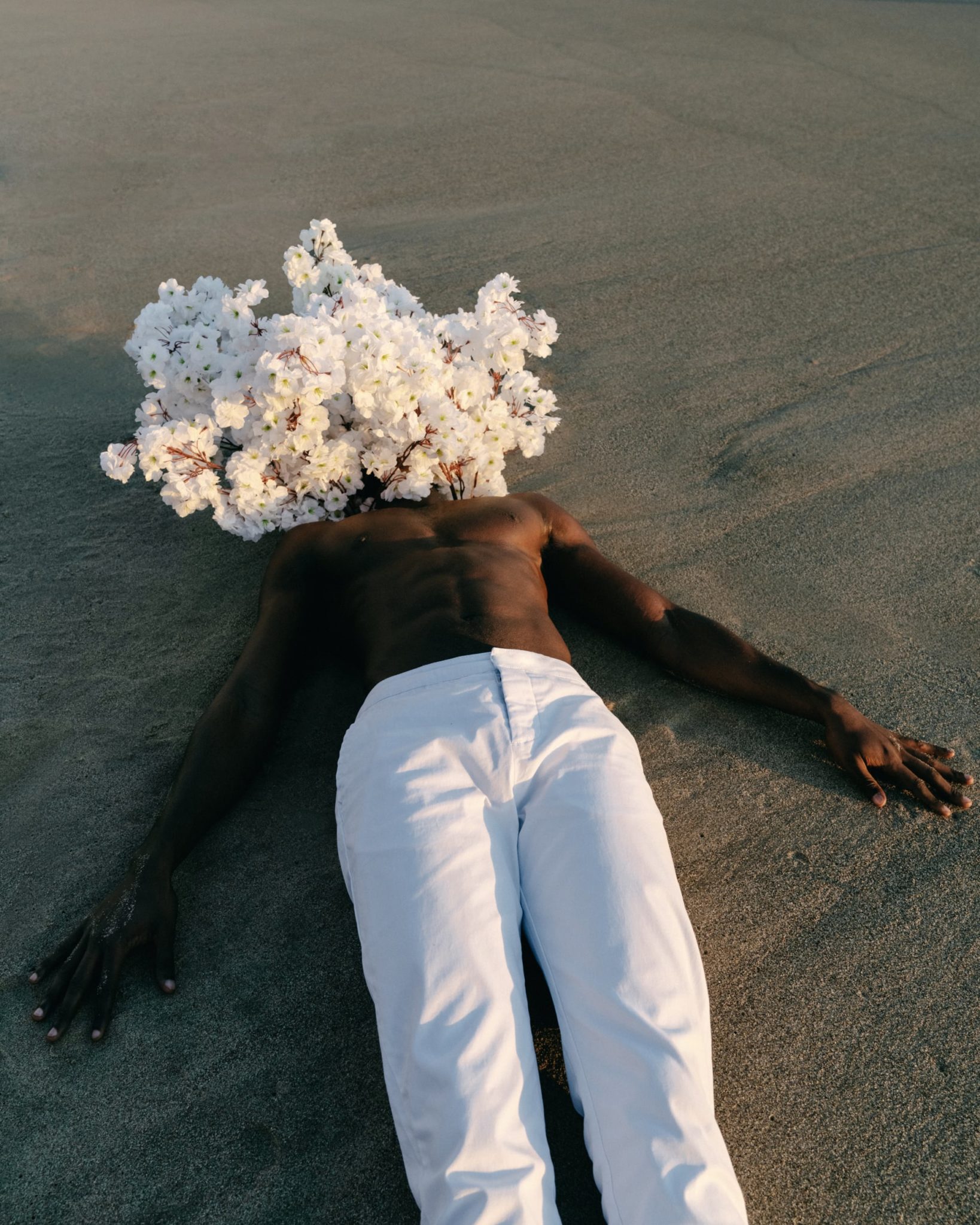 Des fleurs, des fruits, des fonds minéraux comme le sable, l’eau ou simplement le ciel : l’environnement est contemplatif, apaisant, centrant l’attention sur les corps que le photographe entend mettre en lumière. Le corps féminin est souvent au centre de ces mises en scène, mais jamais le photographe ne tombe dans le sensuel. « J’essaie de transmettre les nombreuses vérités et la beauté des personnes de couleur, l’autonomisation et les idéologies de vie dans mes images », explique-t-il à Colossal.