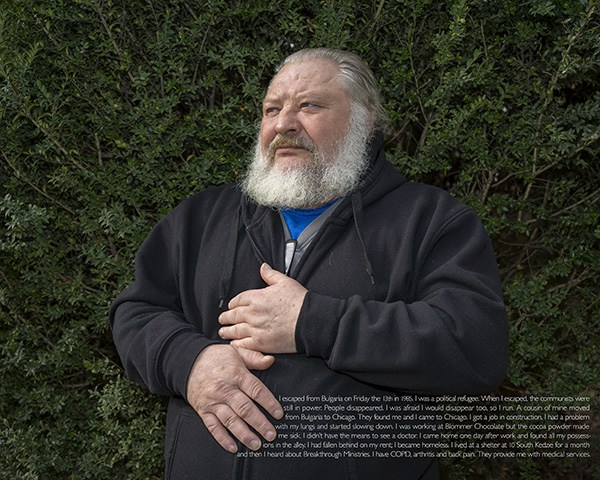 Pour donner vie à ce projet, le photographe a décidé de travailler en collaboration avec des organisations non gouvernementales qui s’occupent des sans-abris au quotidien. L’association Chicago Coalition for the Homeless l’a donc aidé à trouver des personnes à photographier et à interroger. En effet, chaque portrait est accompagné d’un texte illustrant l’histoire et l’état d’esprit de la personne photographiée.
