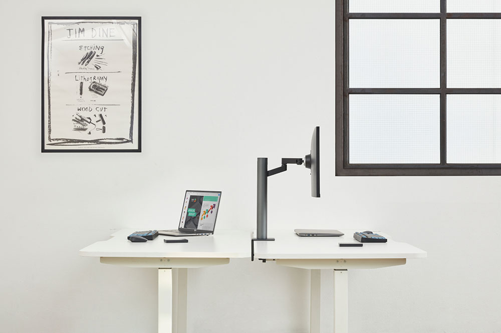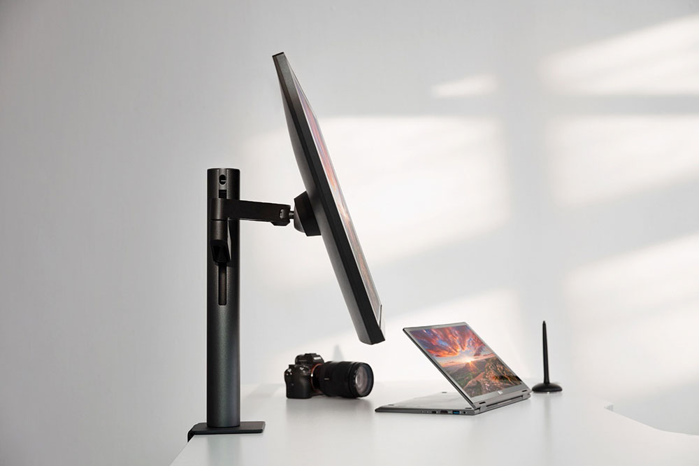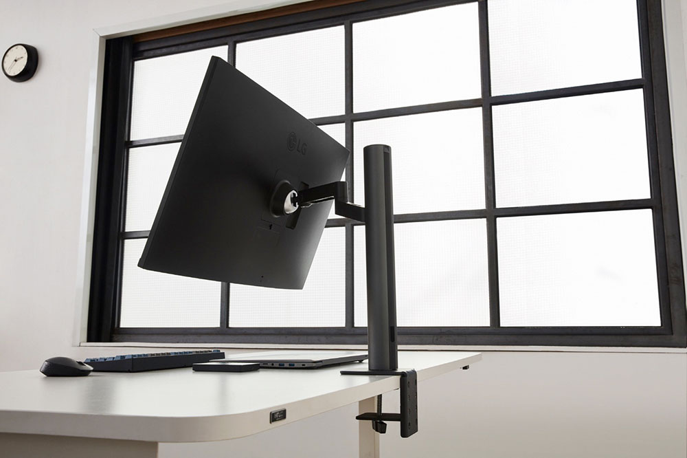 Chargé de séduire les professionnels au bureau encombré, le LG UltraFine Ergo 32UN880 a donc pour principale particularité de s’équiper d’un pied ergonomique plutôt que d’un pied classique. Celui-ci se fixe en bout de table de manière à ne pas empiéter sur l’espace de travail, tandis que le bras amovible qui lui est attaché permet de choisir la position de l’écran avec aise. Le constructeur sud-coréen précise ainsi qu’il est possible de faire varier sa hauteur, son inclinaison et sa distance par rapport à l’utilisateur, voire même de l’orienter dans une direction opposée afin de partager des informations avec un collègue ou un client.