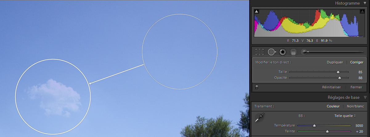 L’outil tampon ou plus précisément : retouche des tons directs, trouve son utilité dans la suppression de tâches provenant de poussières sur le capteur. Il permet aussi de corriger la teinte d’une zone en basant sur un tampon de référence. On peut le trouver dans l’onglet Développement, panneau de droite, sous l’histogramme.