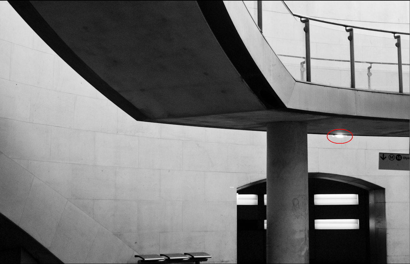 Dans ce premier exemple, je voulais supprimer la lampe juste sous la plateforme, à droite. J’ai pu copier le bord de la plateforme mais, pour avoir le meilleur rendu, j’ai dû faire de petits tampons de duplication.