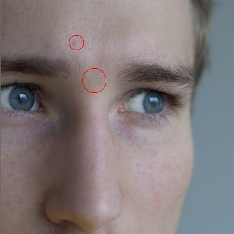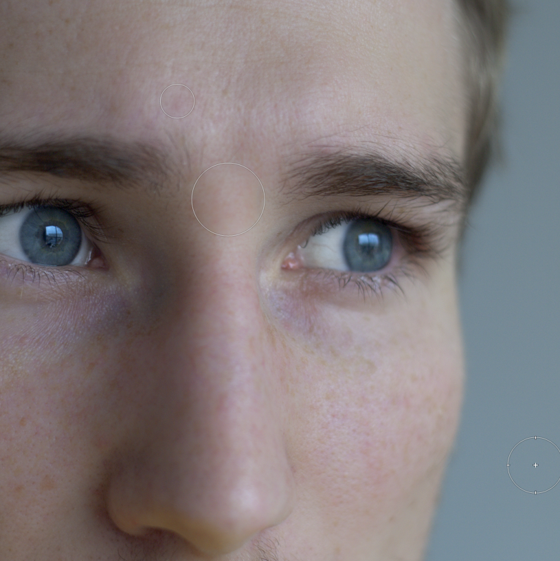 Un dernier exemple sur le portrait. On va essayer de masquer la rougeur au-dessus de l’oeil ainsi que les sourcils au-dessus du nez. On utilise la fonction correction pour garder un le grain de peau mais, effacer les défauts.