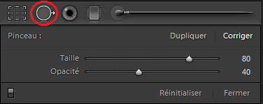 Pour lancer l’outil vous pouvez également utiliser le raccourci : « Q ». Il est possible de régler la taille de la zone à modifier à l’aide de la molette, de la tirette ainsi qu’en tirant sur le cercle. Pour masquer l’outil et avoir un aperçu du rendu, on retrouve le même raccourci que pour l’outil pinceau ou filtre gradué : « H ».