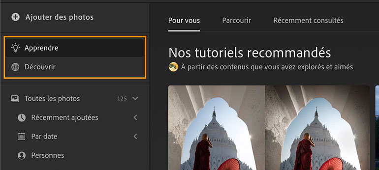 Cette nouveauté ne concerne que la version pour poste de travail, et plus précisément l’onglet Apprendre et découvrir. Désormais, l’affichage des tutoriels guidés s’effectue en fonction des publications que vous appréciez, mais aussi des personnes que vous suivez dans la communauté Lightroom, et enfin de vos dernières activités de modification sur vos images. Les suggestions sont donc un véritable flux personnalisé à vos besoins.