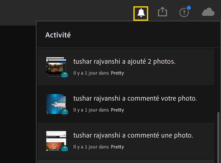 Dans le panneau d’activité de Lightroom, l’activités des personnes est désormais combinée et s’affiche sous la forme de notifications. Notez que pour les afficher, il vous faudra d’abord cliquer sur l’icône en forme de cloche dans le coin supérieur droit de l’écran.