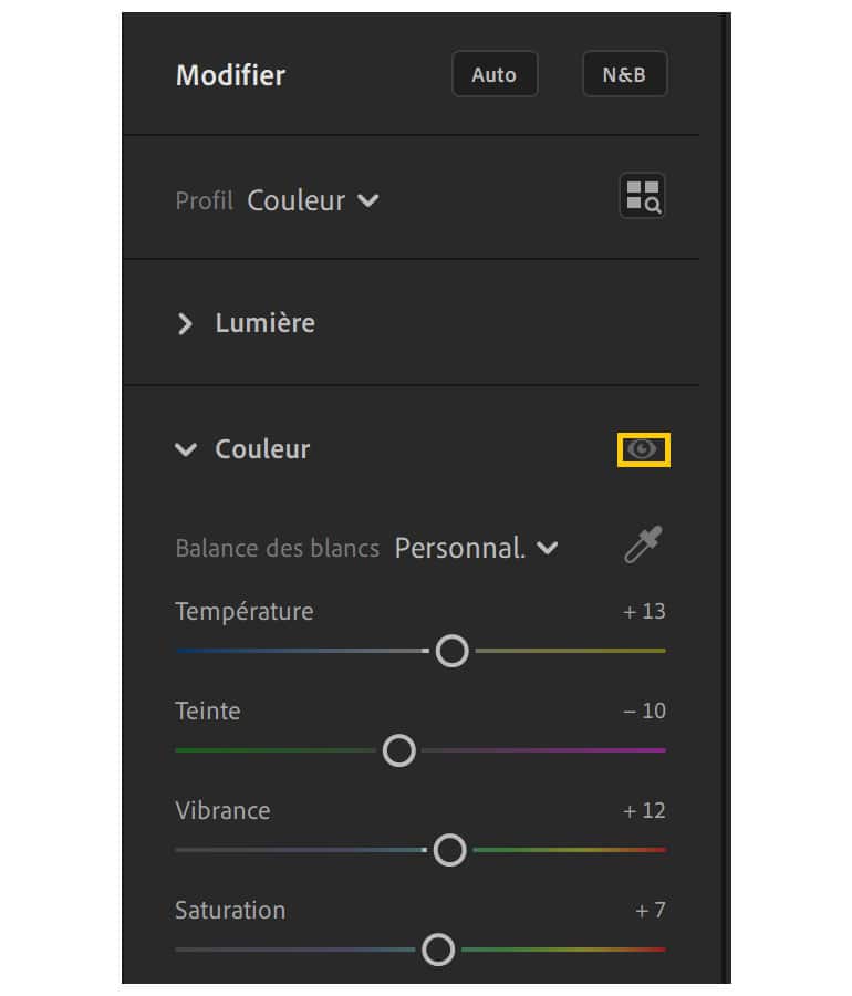 Afficher une image modifiée sans les paramètres d’un panneau est désormais possible d’un simple geste. Il vous suffit de réaliser un appui long sur l’icône en forme d’œil pour faire disparaître de votre vue les paramètres d’un panneau donné.