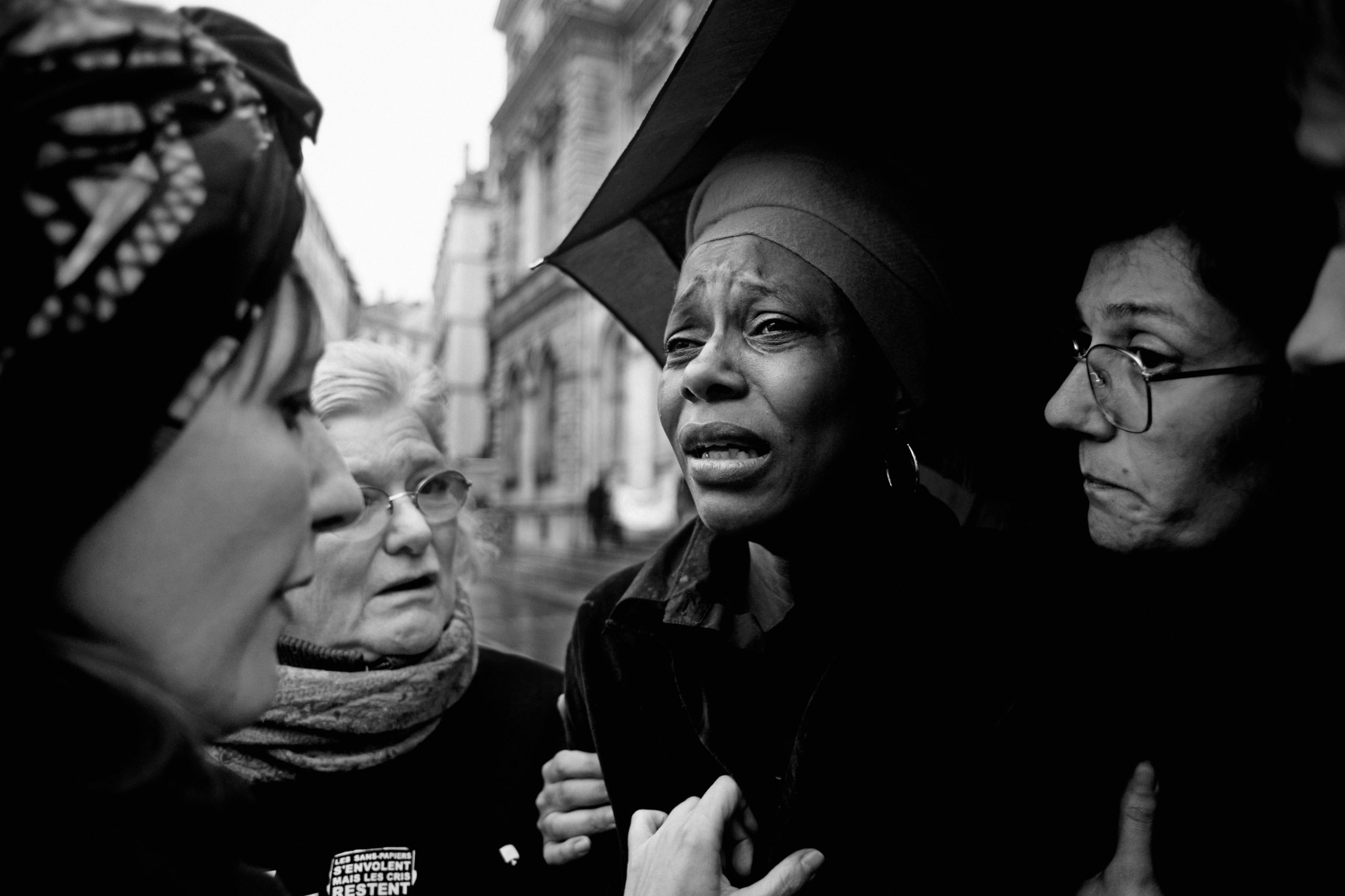 Florence la compagne de Guilherme, angolais sans papiers sur le territoire français depuis dix ans, s’effondre lorsqu’elle apprend qu’il a été embarqué dans un avion du ministère jusqu’à Roissy. La préfecture craignait une trop forte mobilisation de ses soutiens, sur un vol au départ de Lyon. À Paris, le commandant de bord du vol Air France refusera d’embarquer Guilherme entravé et bâillonné. Lyon, le 7 avril 2010 © Bertrand Gaudillère / Item -