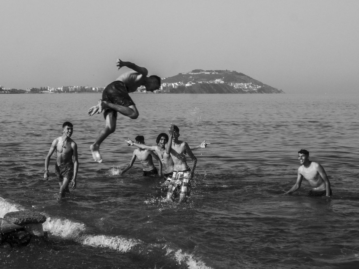 Non loin de la frontière avec Ceuta, des jeunes plongent dans la mer. Dans ce groupe de jeunes, tous ont tenté la traversée illégale de la frontière, soit par la terre, soit par le mur de protection. Certains ont vécu sur place de nombreux mois et se sont retrouvés expulsés après de multiples tentatives pour passer le détroit de Gibraltar de façon clandestine. © Hervé Lequeux / Hans Lucas -