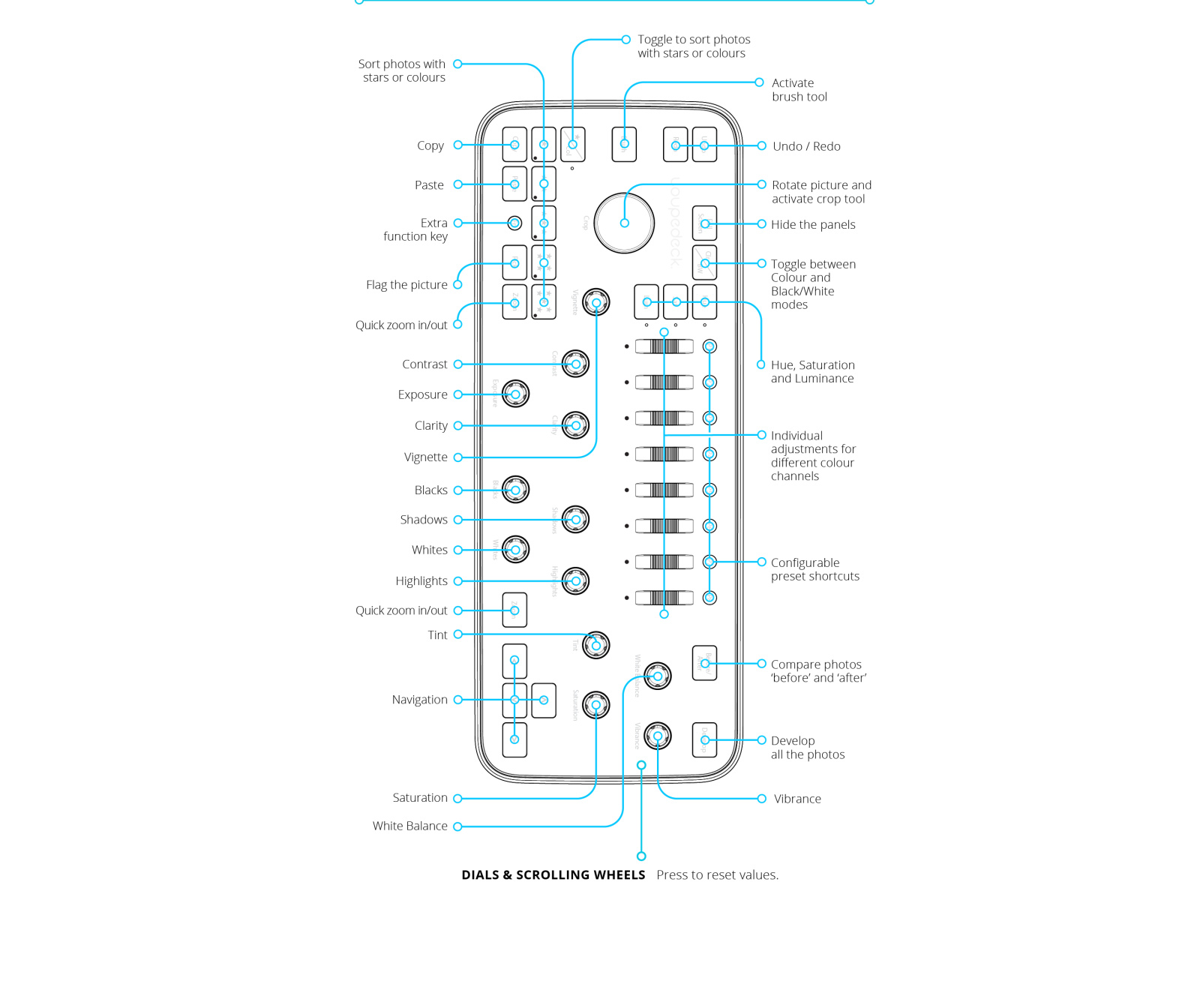 Ainsi, tout a été pensé par des photographes pour des photographes, puisque les molettes, curseurs et boutons représentent des fonctions très souvent répétitives (comme la comparaison avant / après, le zoom, la balance des blancs, l’annulation d’une action….) qui désormais tombent sous les doigts. Qu’il s’agisse de la phase de tri ou de retouche, tout a été pensé pour gagner en temps et en efficacité.